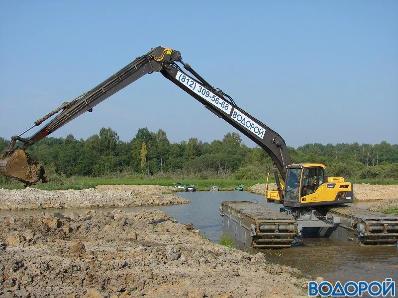 Благодаря своим гусеницам на понтонах экскаватор может проходить по топкой, заболоченной местности и находиться на плаву в акваториях любых водоёмов, выполняя различные виды земляных и гидротехнических работ.
