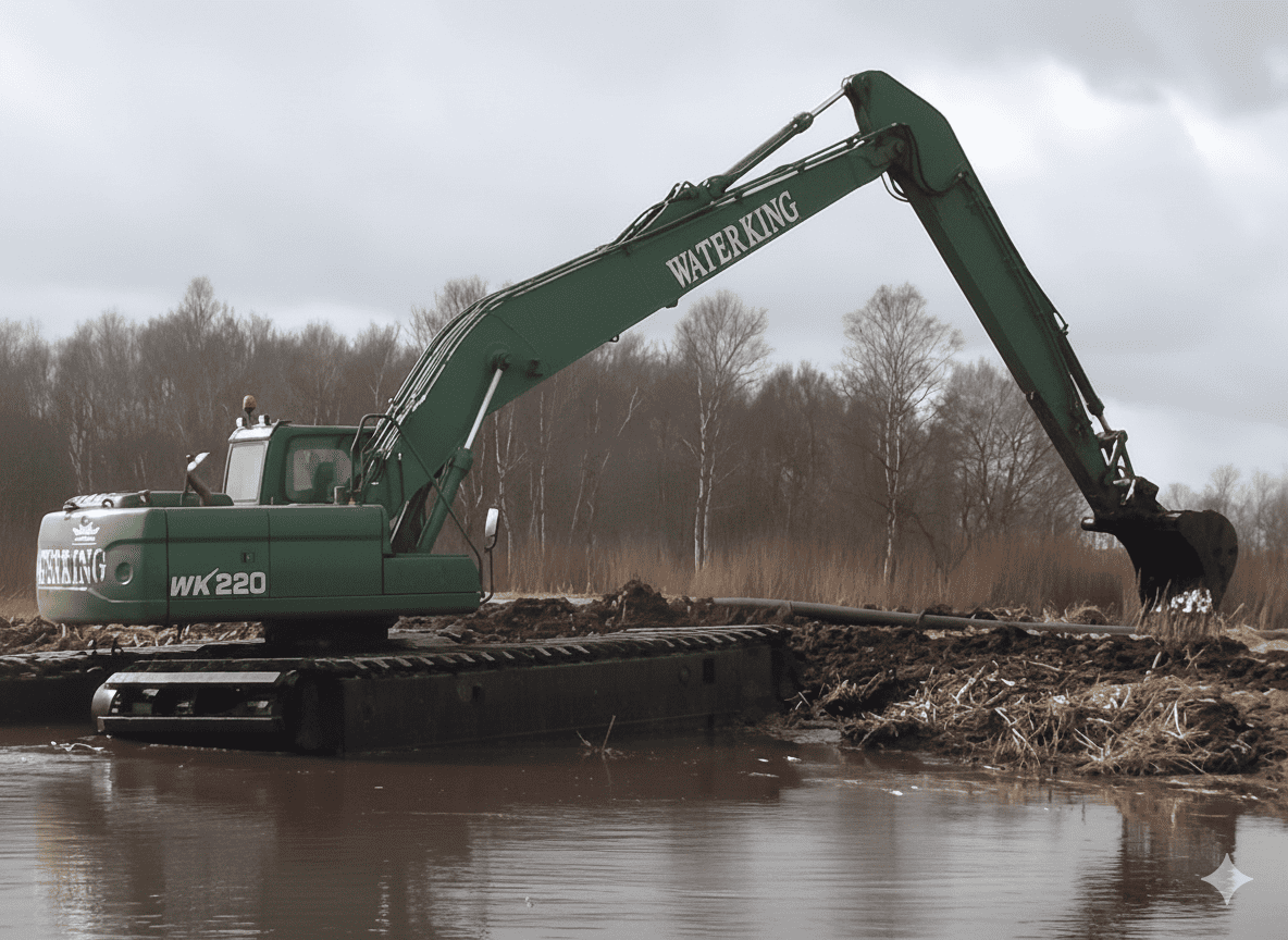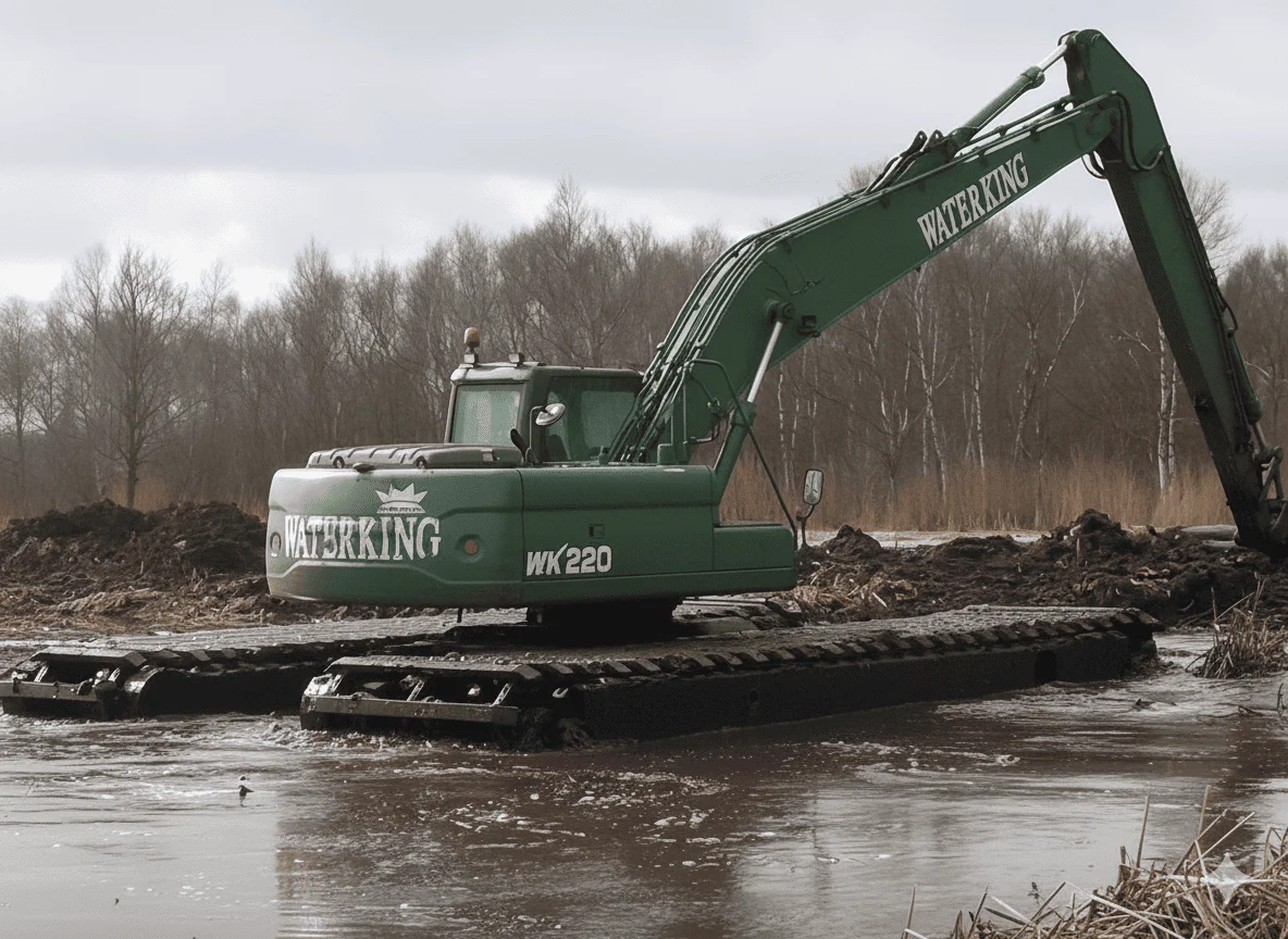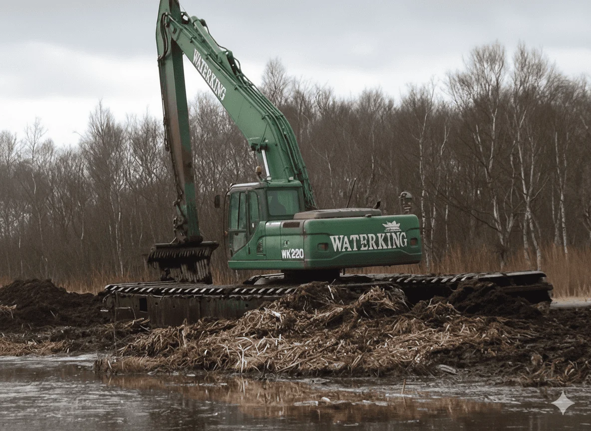 Гидравлическая землеройная машина на плавучей платформе Waterking высокоэффективна при работах любой сложности. Низкое давление на опорную поверхность, достигающееся благодаря герметичным гусеницам, минимизируют оседание грунта. Рабочий сектор в 360 градусов обеспечивает выполнение работ без лишних перемещений.