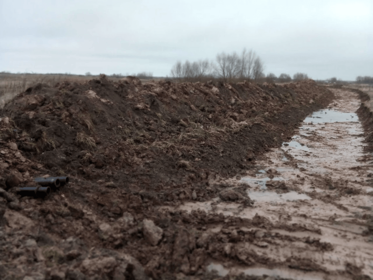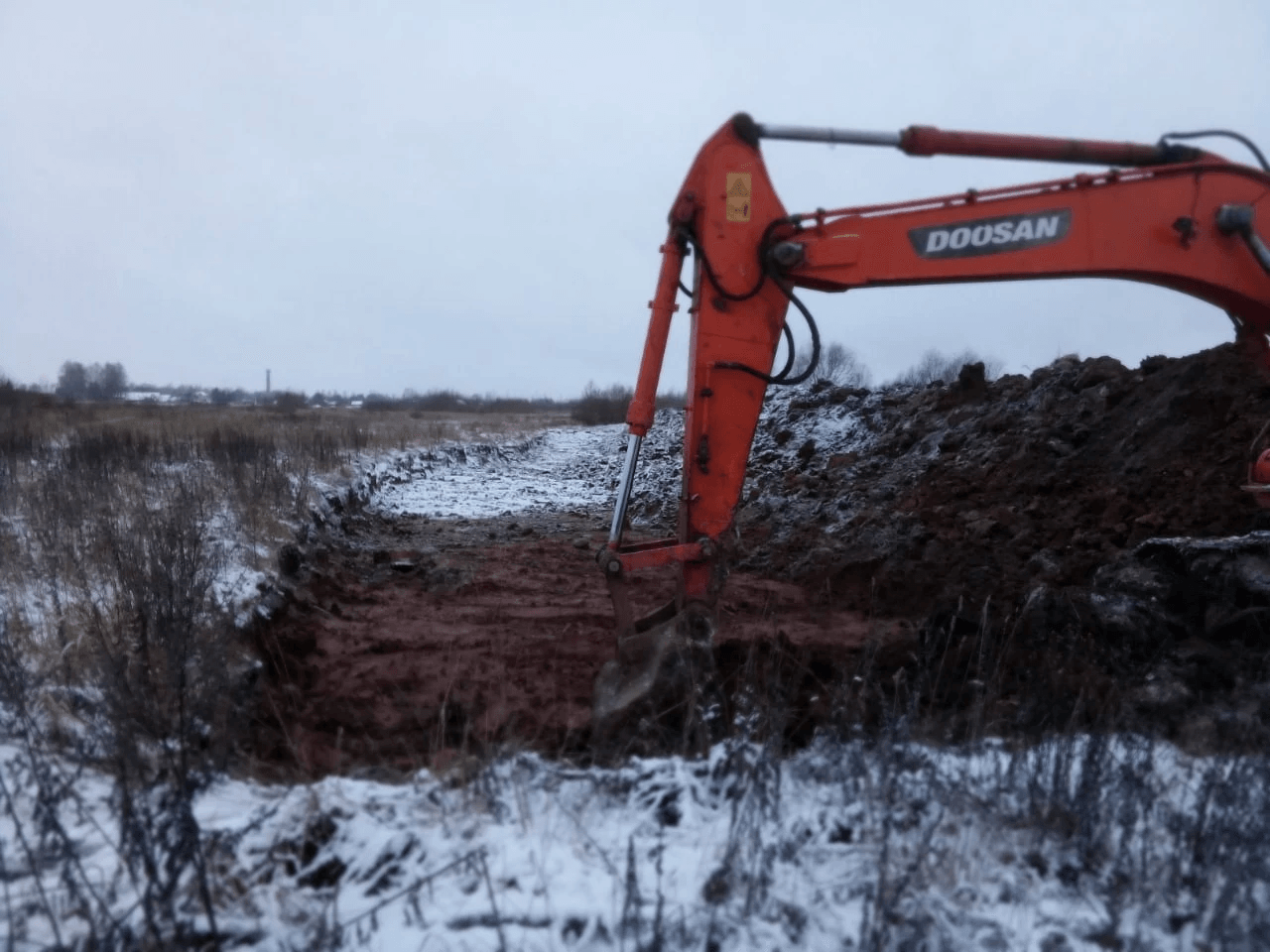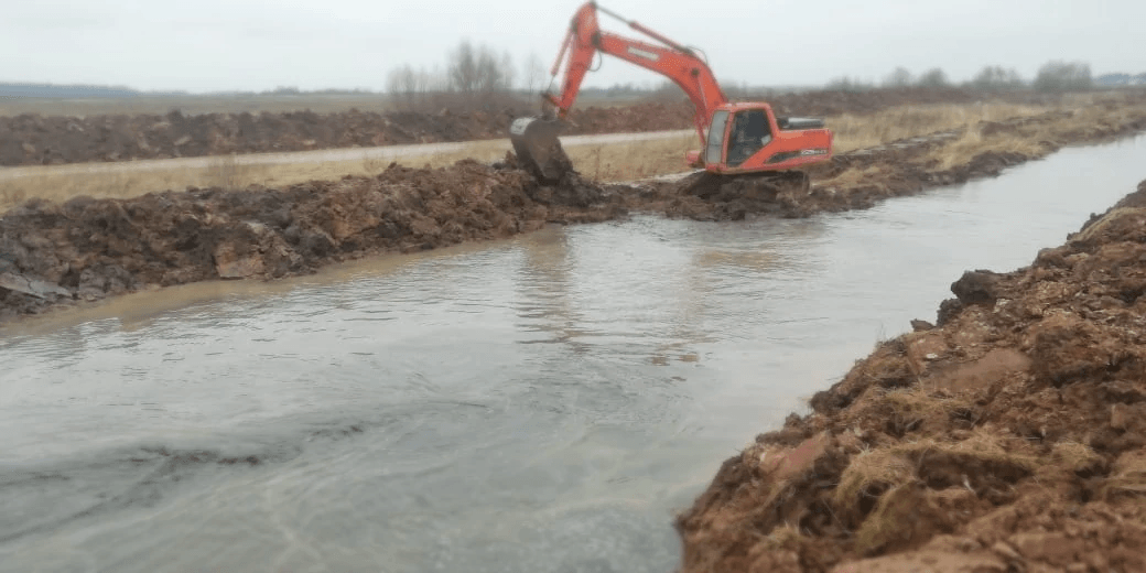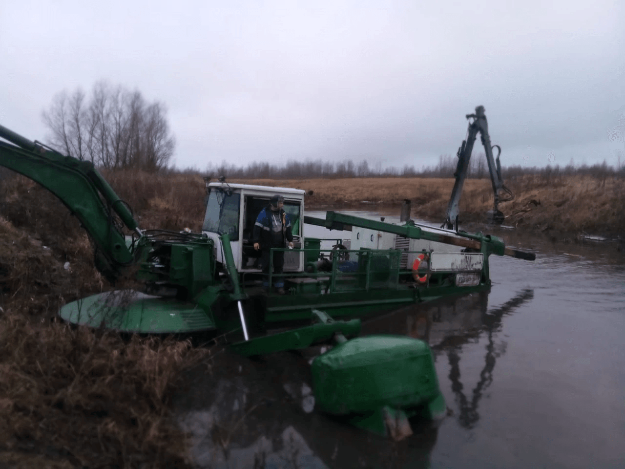 Перед началом очистки канала условно-чистых вод выполнено устройство карты намыва из местного грунта с помощью бульдозера и экскаватора.