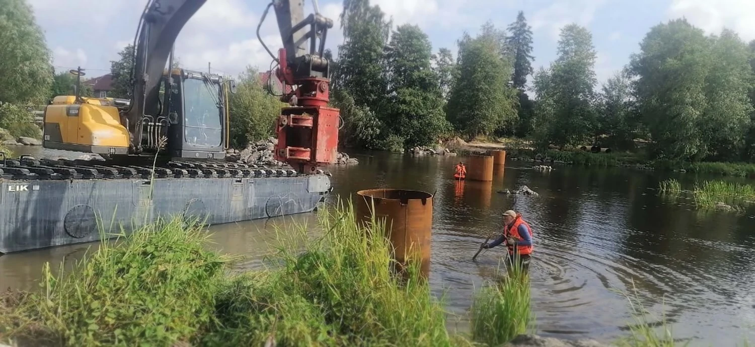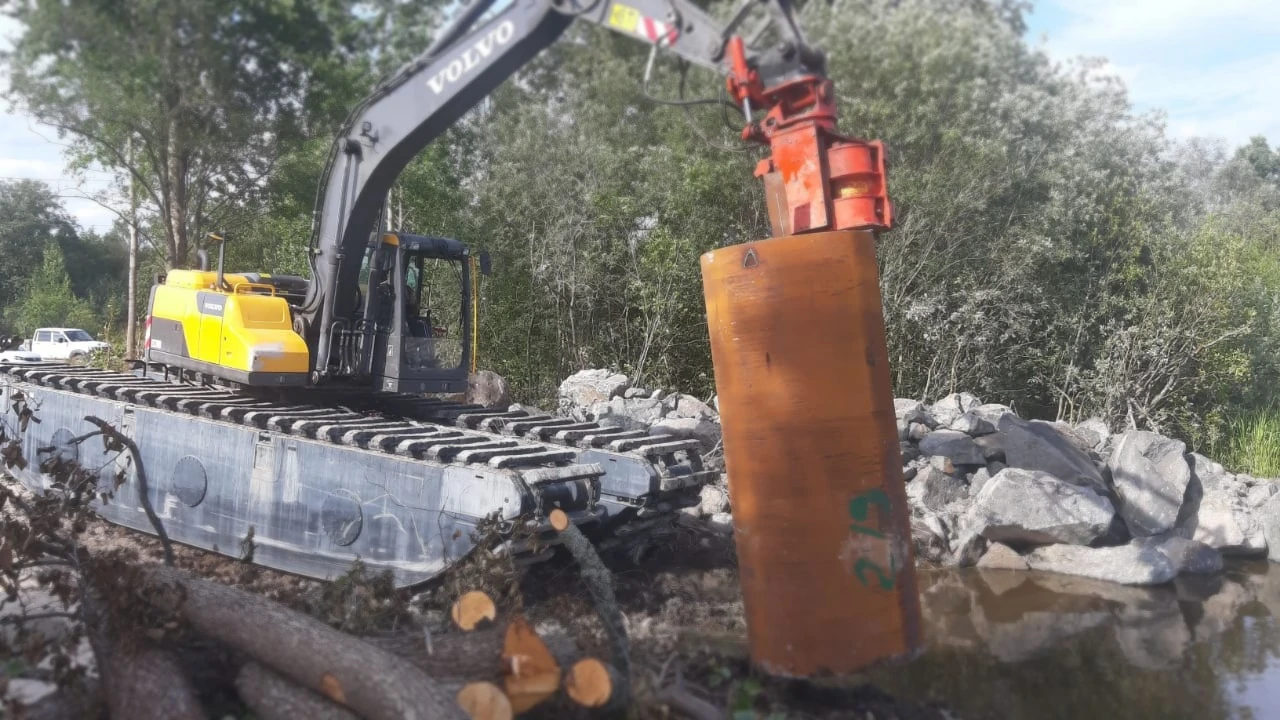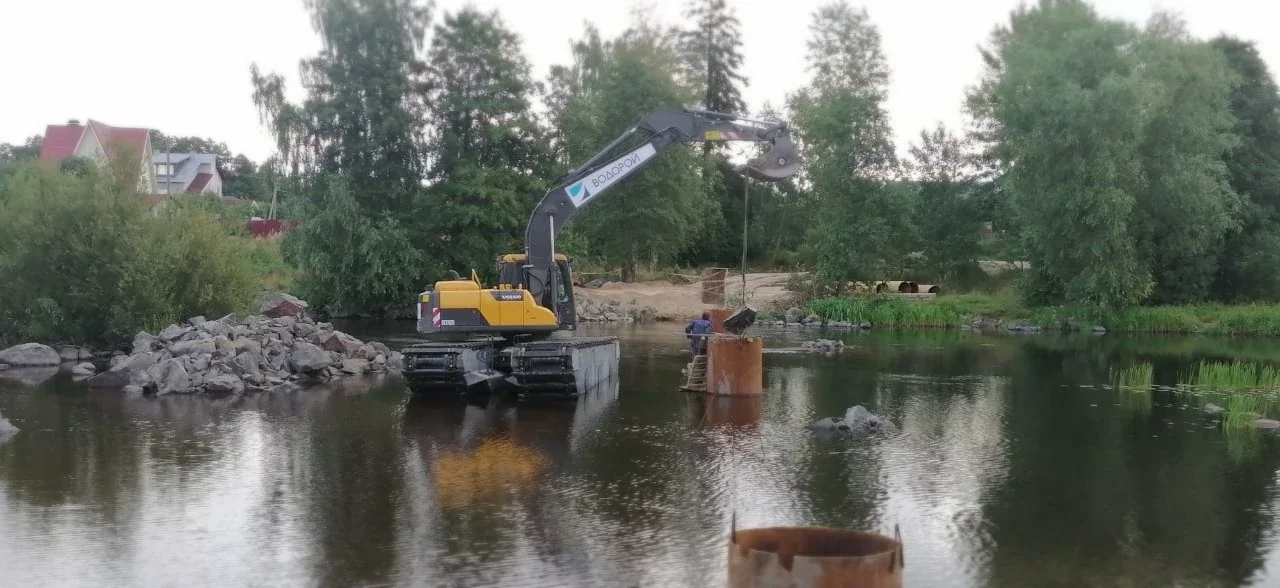 Работы по вибропогружению стальных труб выполнены плавающим экскаватором Volvo EC170D EIK.