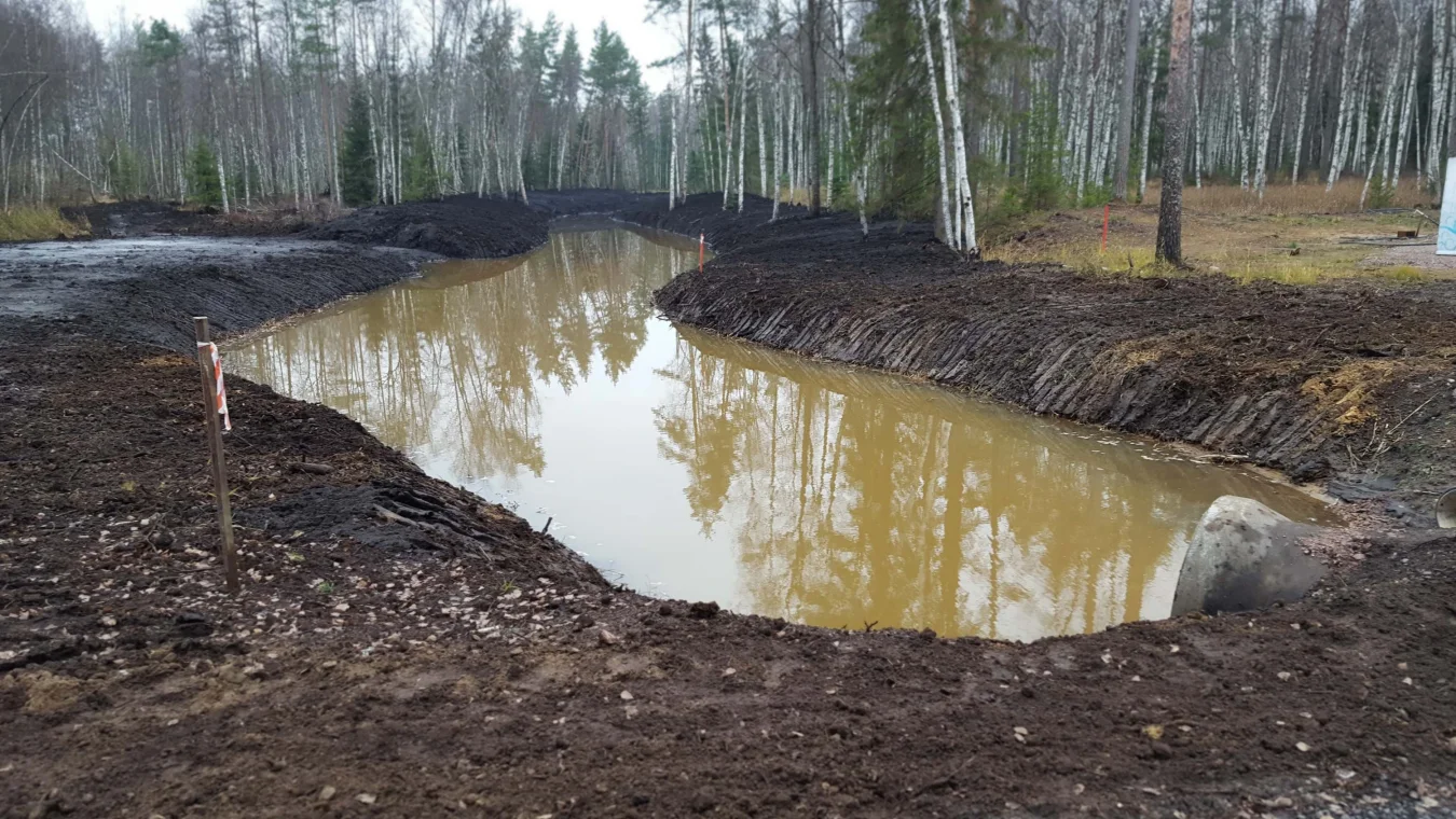 Работы выполнены в болотистой местности экскаватором-амфибией Volvo EC179D.