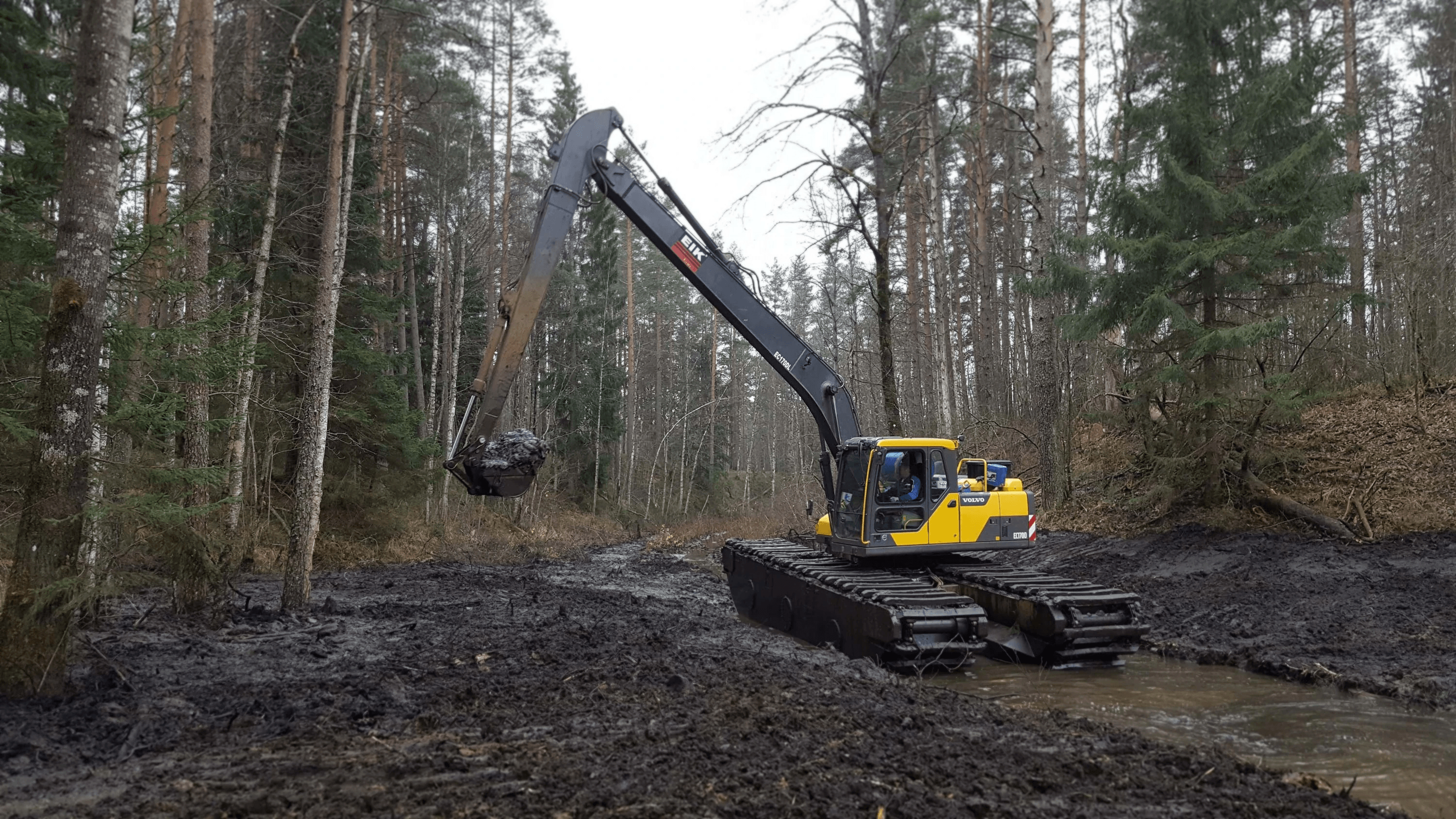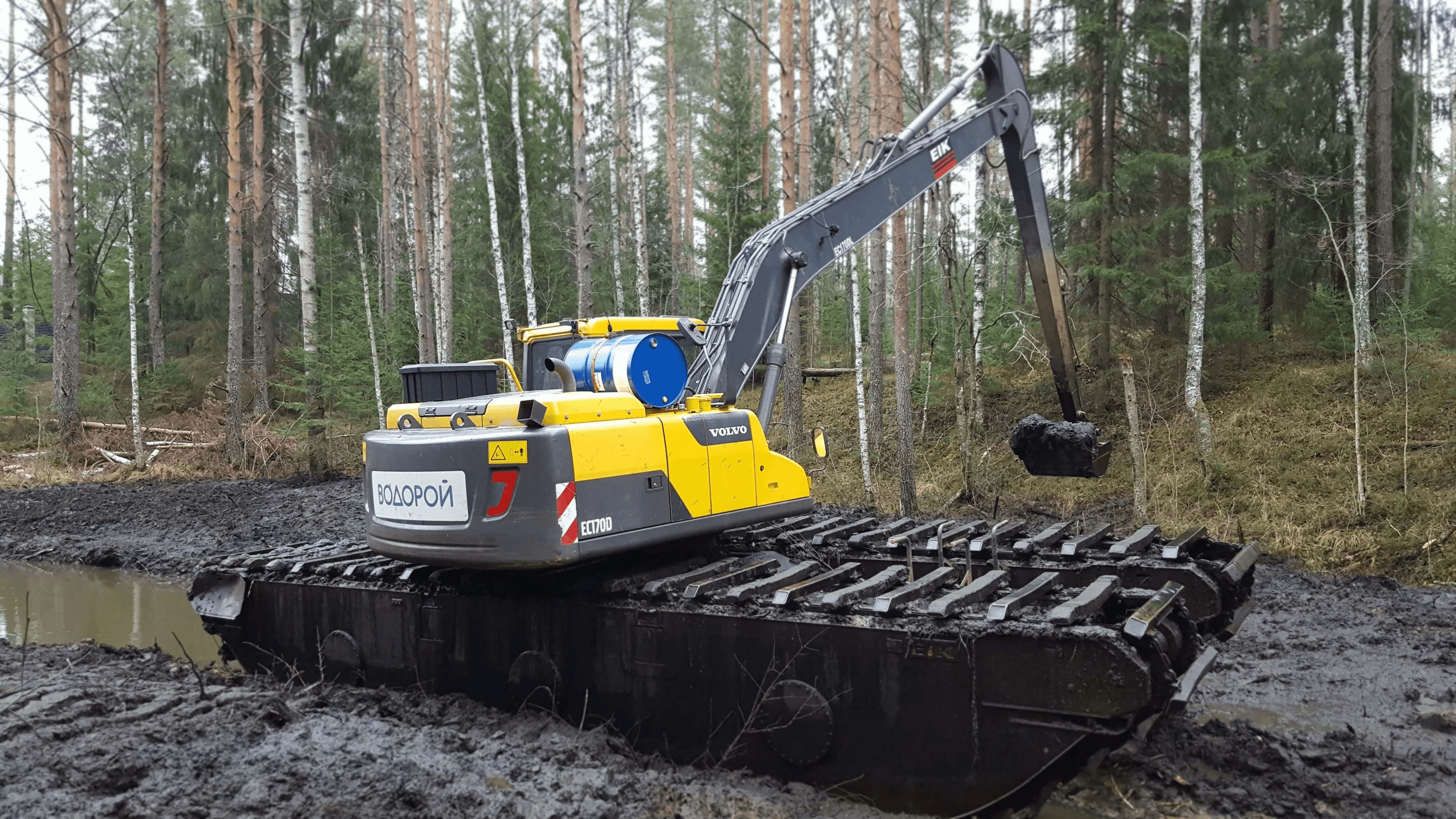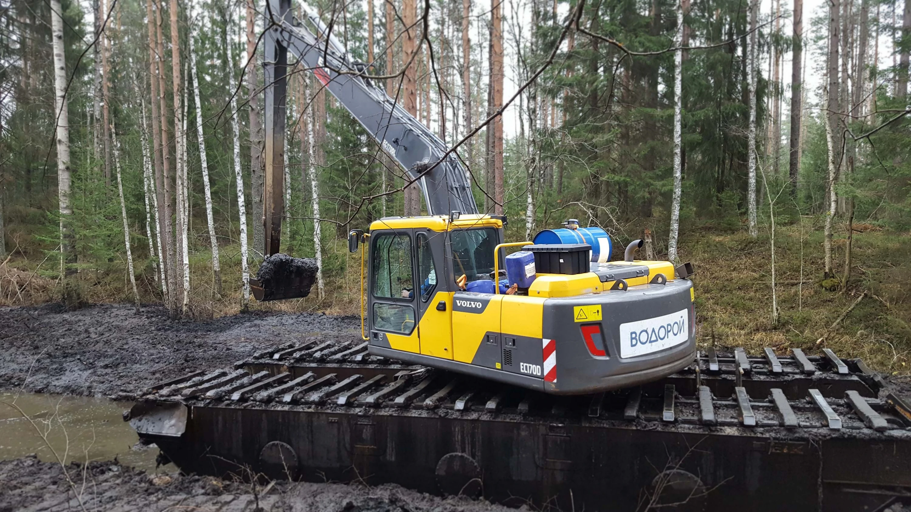 Работы выполнены в болотистой местности экскаватором-амфибией Volvo EC179D.