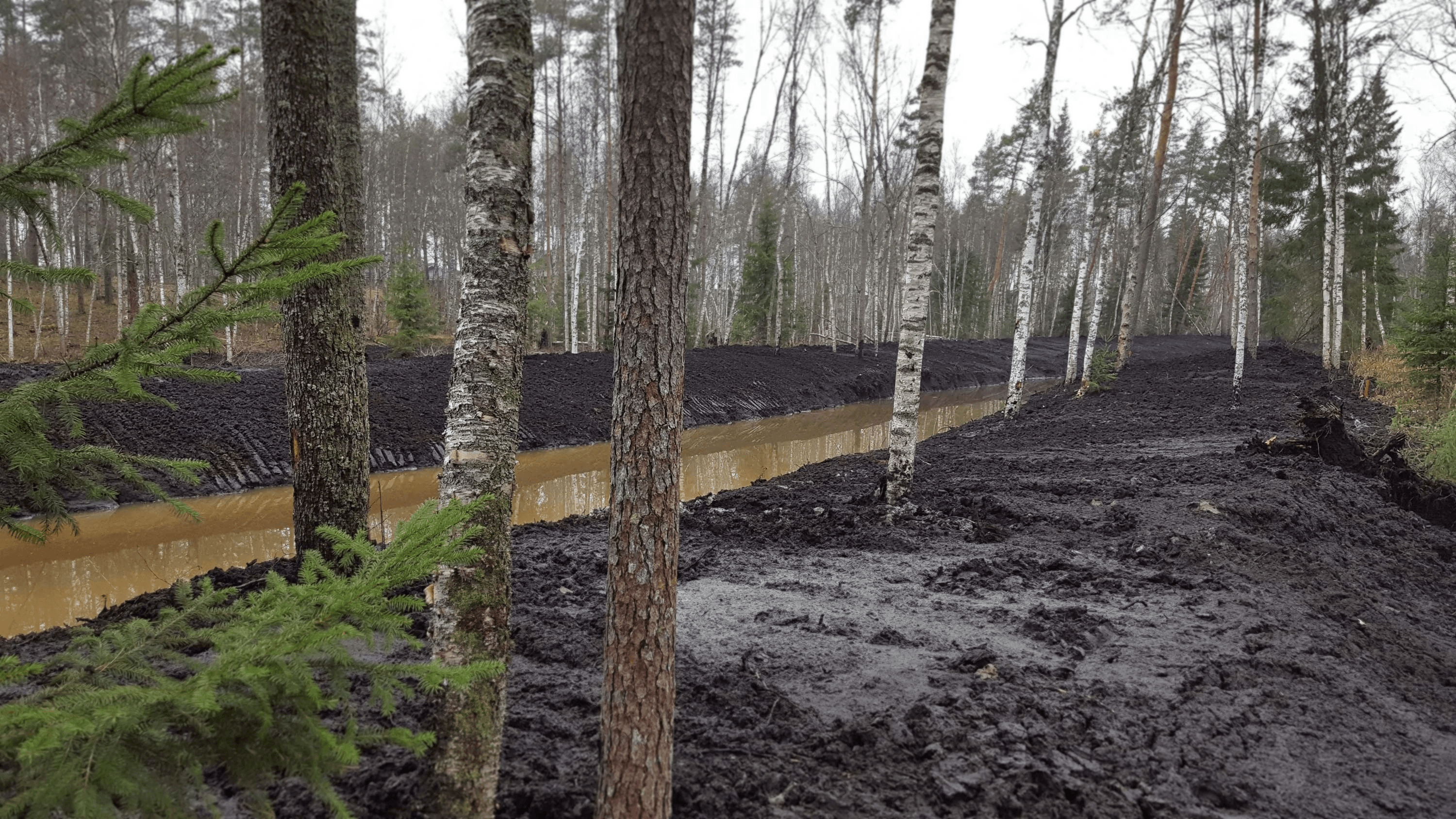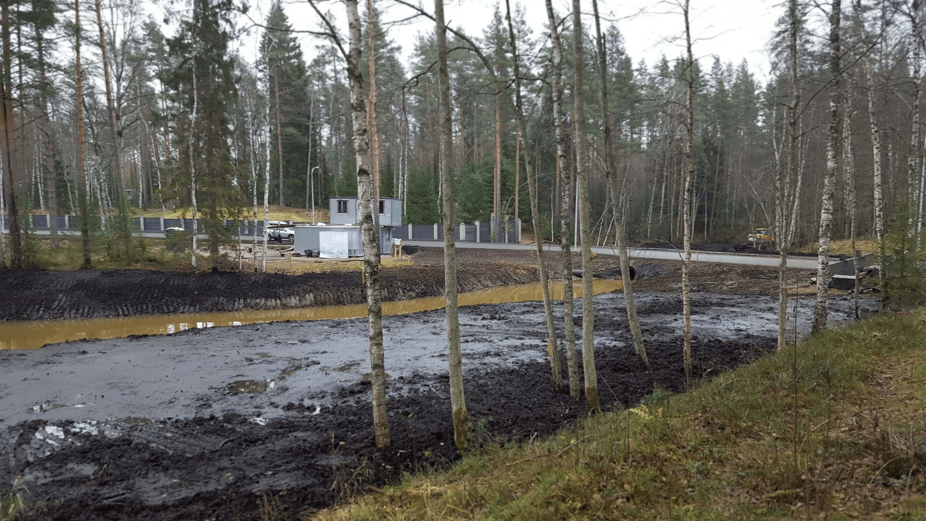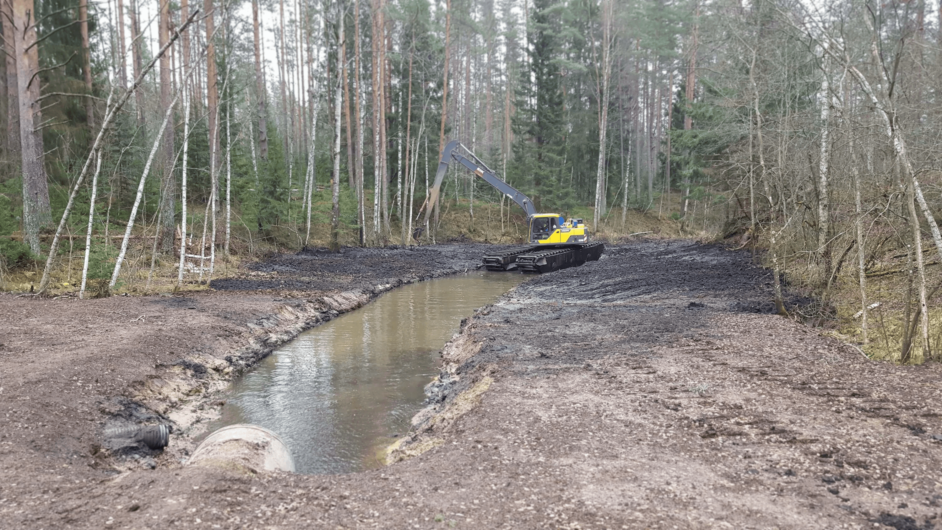Работы выполнены в болотистой местности экскаватором-амфибией Volvo EC179D.