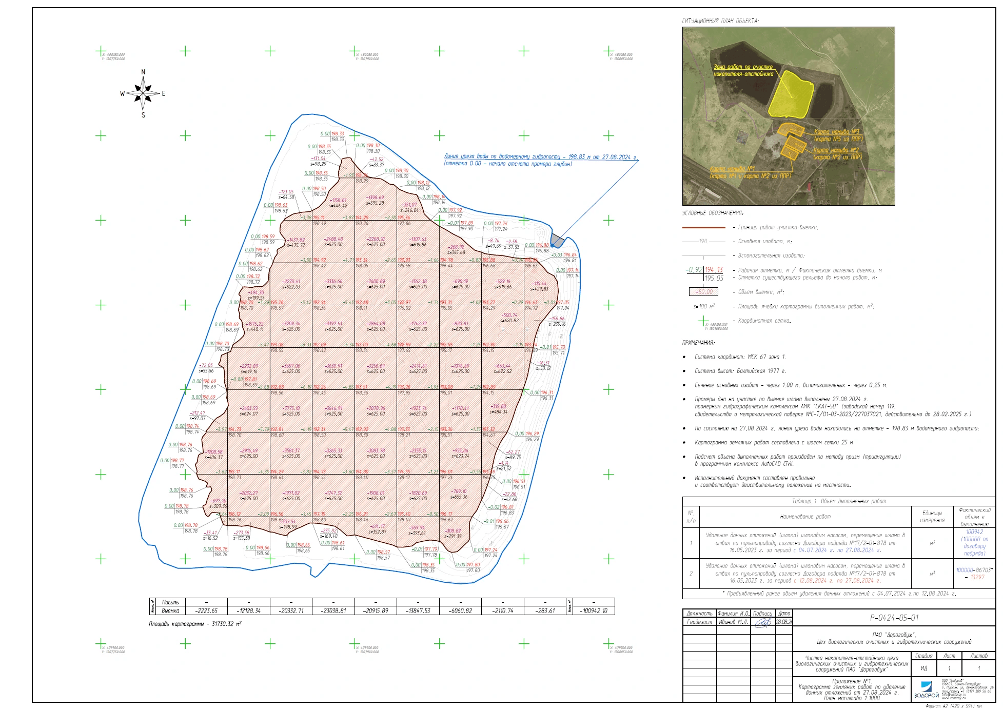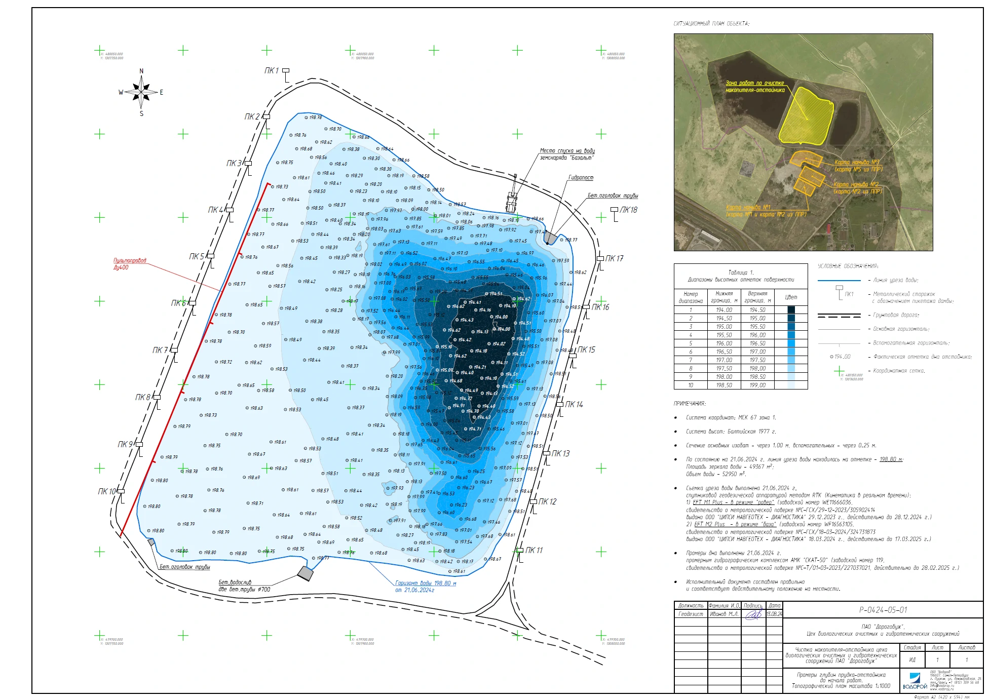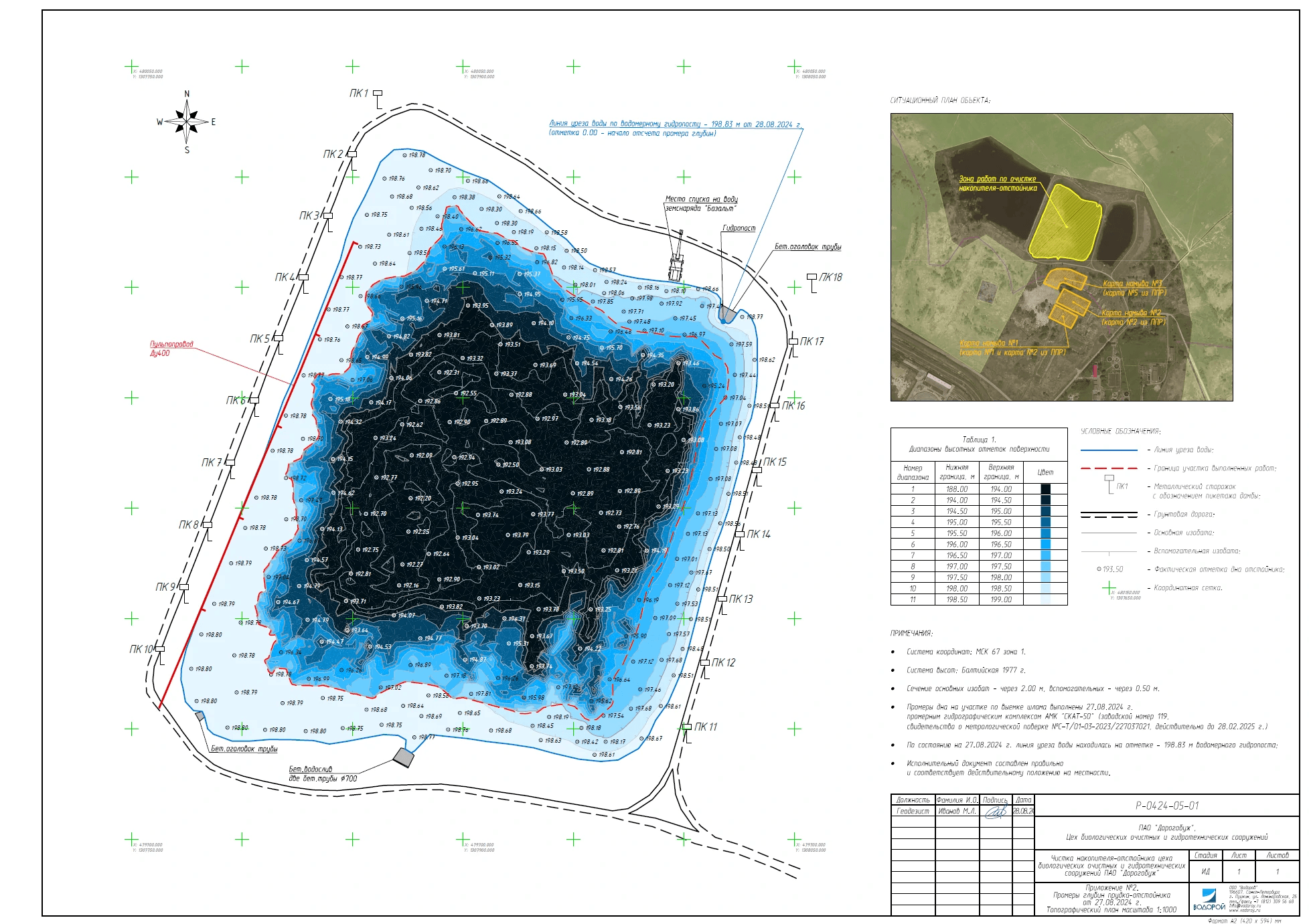 - проведение предпроектных, промежуточных и итоговых геодезических изысканий, включающих в себя топографическую съемку береговой зоны и батиметрическую съемку прудка-отстойника