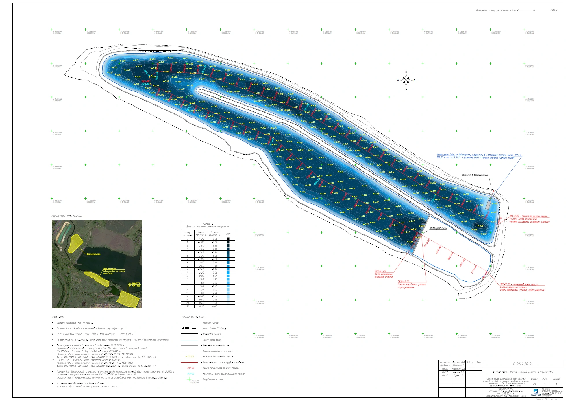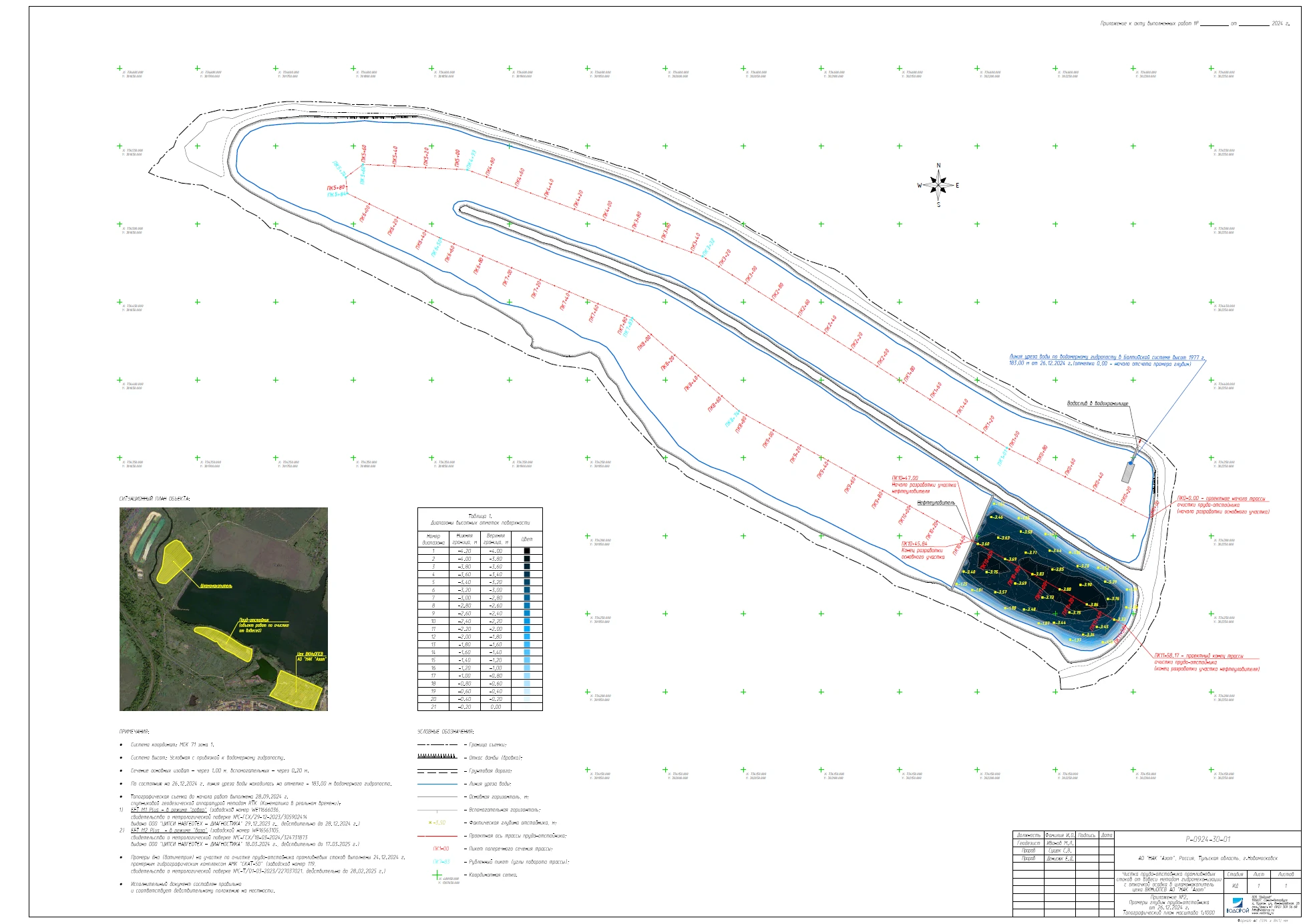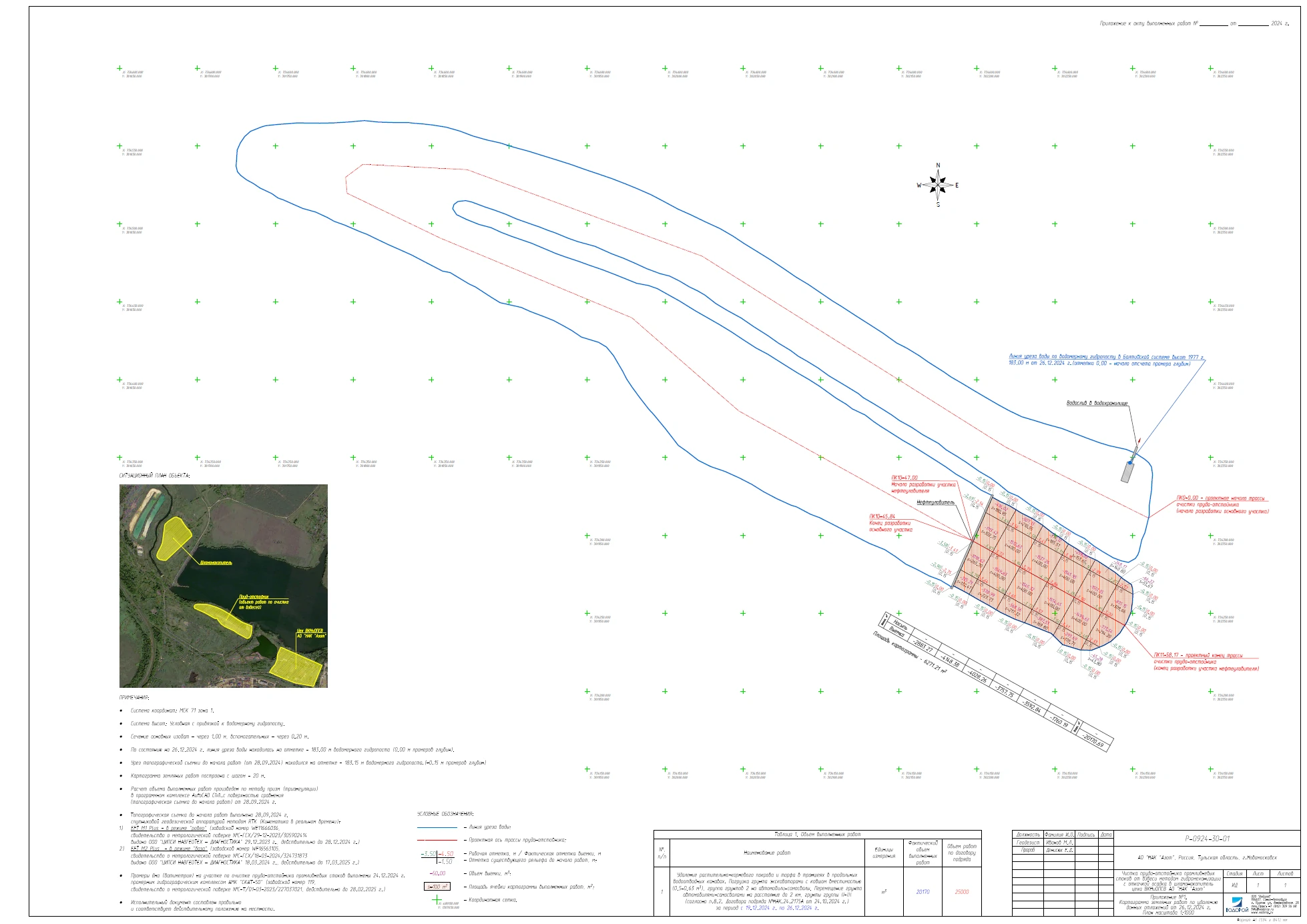 - проведение предпроектных, промежуточных и итоговых геодезических изысканий, включающих в себя топографическую съемку береговой зоны и батиметрическую съемку прудка-отстойника