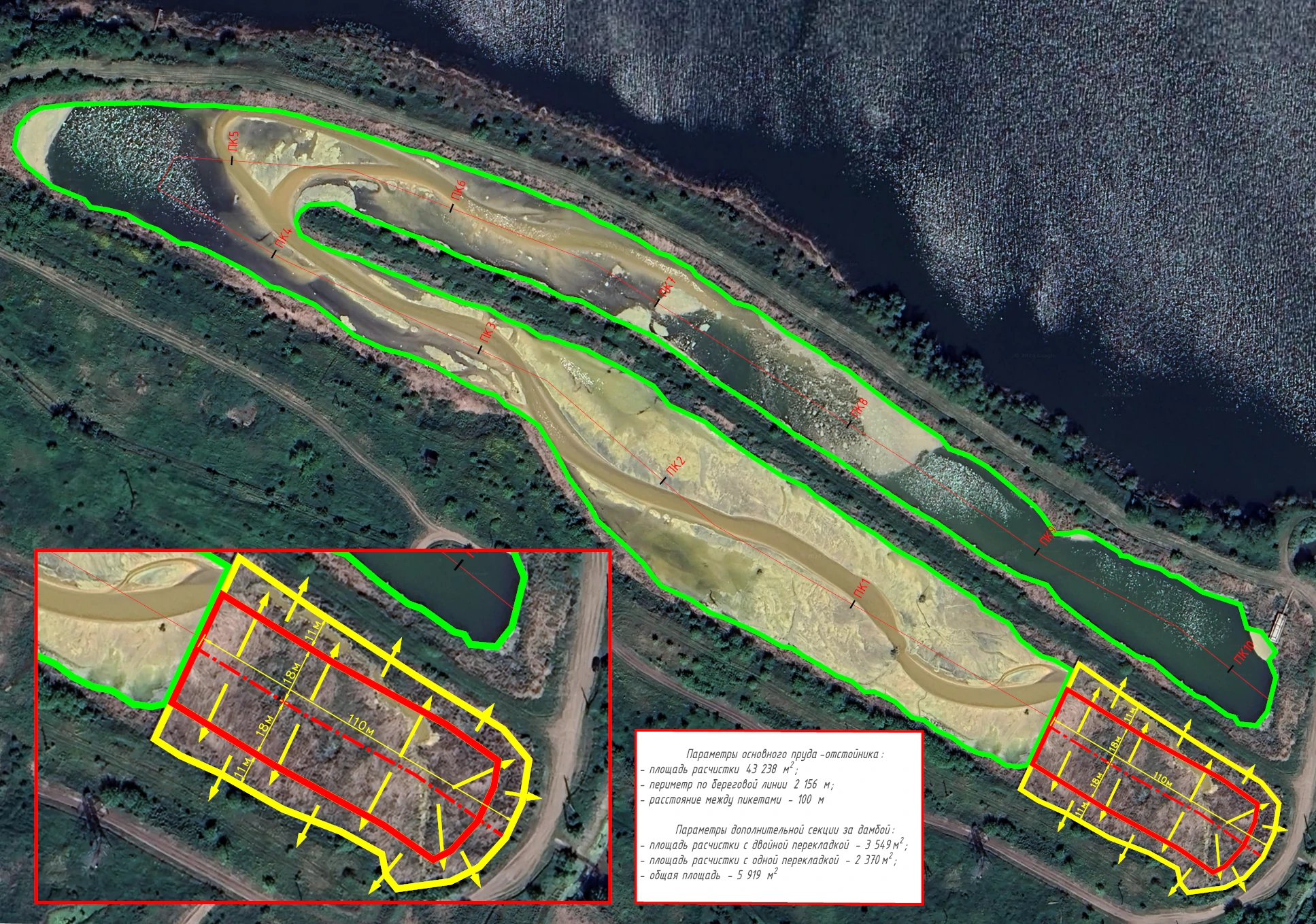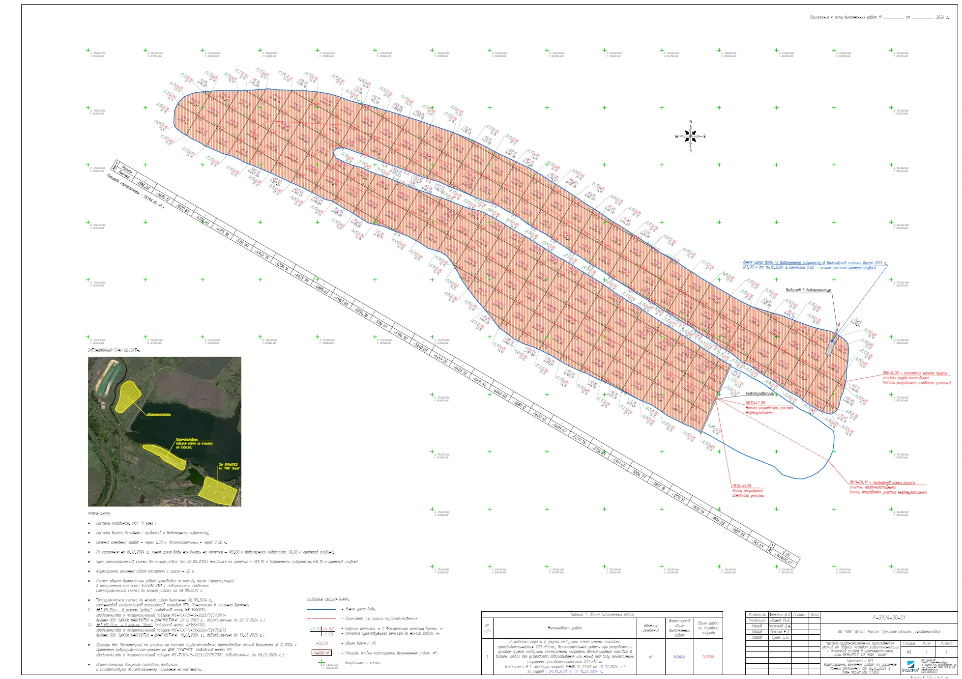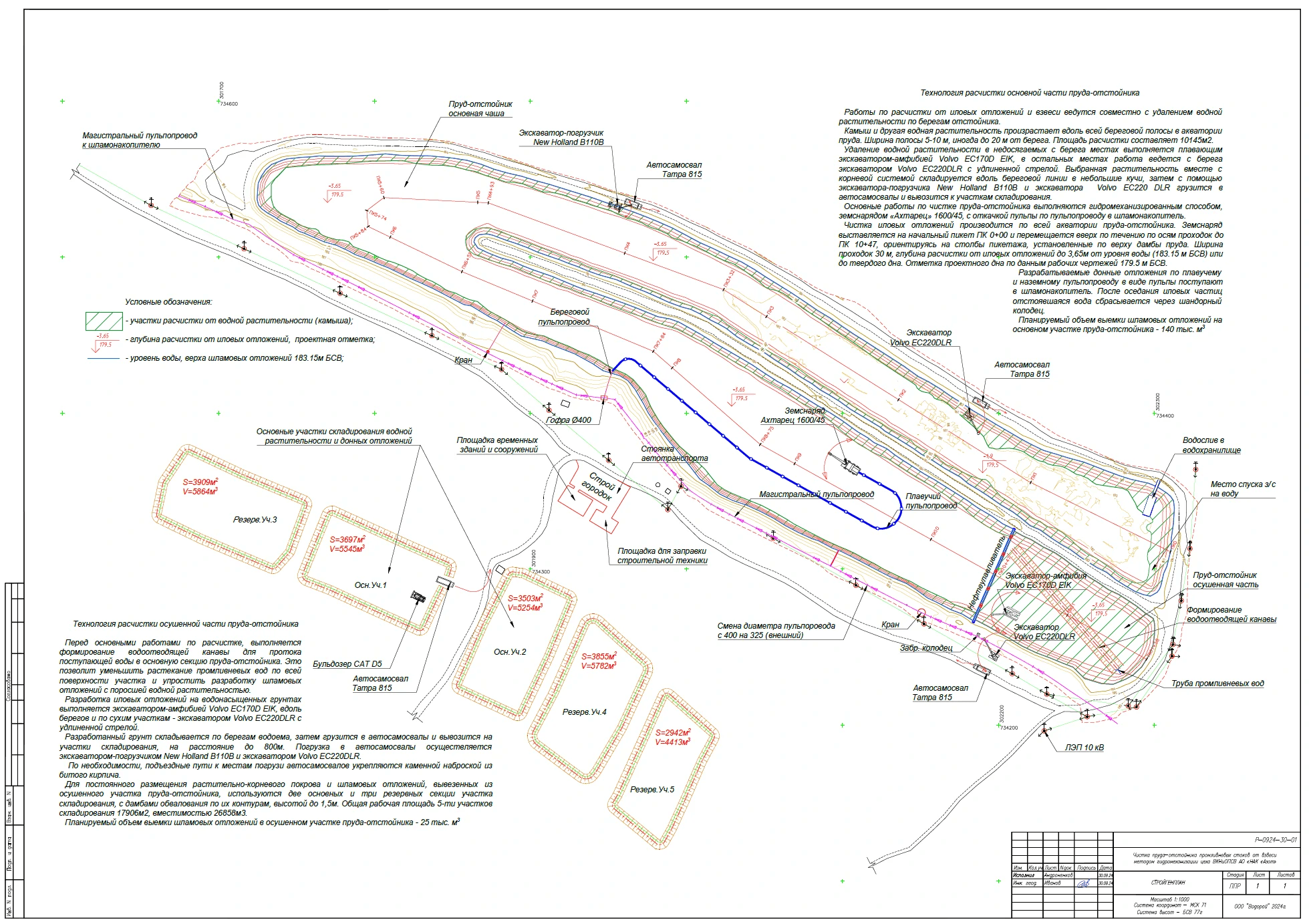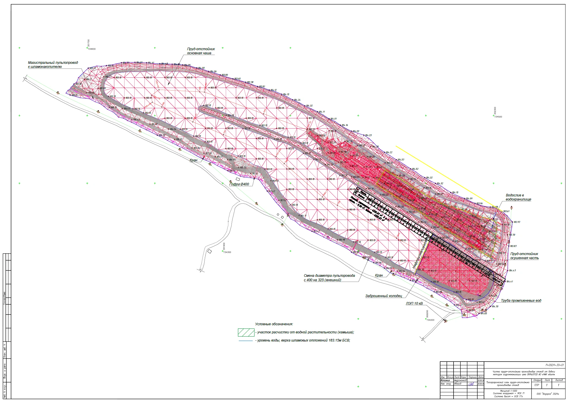 - проведение предпроектных, промежуточных и итоговых геодезических изысканий, включающих в себя топографическую съемку береговой зоны и батиметрическую съемку прудка-отстойника